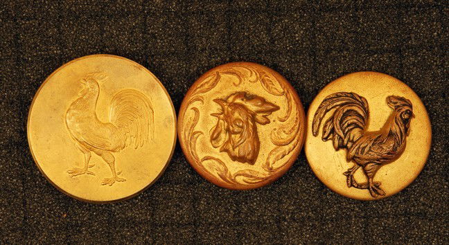 THREE ROOSTER BUTTONS. All large stamped brass: 2-pi