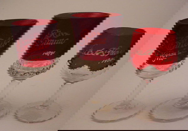 SoldTARENTUM ATLANTA (OMN) / ROYAL CRYSTAL - RUBY-STAINEDTARENTUM ATLANTA (OMN) / ROYAL CRYSTAL - RUBY-STAINED WINES, LOT OF FOUR, colorless.Tarentum Glass Co. 1894-1898. 4" H.Undamaged, except one example with a minute pattern bruise, possibly as made.ProvSee Sold Price