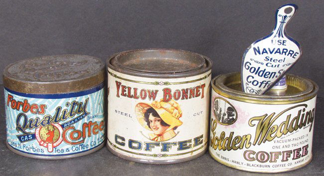 Three Sample Size Coffee Tins and Tin Litho Scoop