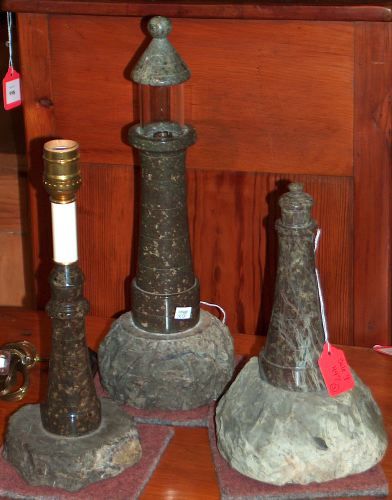 THREE SERPENTINE MARBLE LIGHTHOUSE SCULPTURES, Eng
