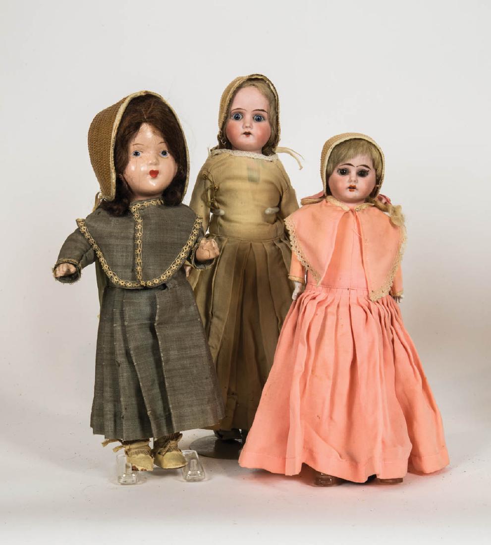 THREE SHAKER DRESSED DOLLS Two porcelain and one