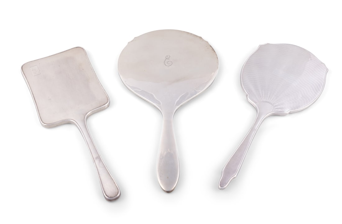 THREE SILVER HAND MIRRORS, one rectangle, two circular, Birmingham 1920, 1926, 1930