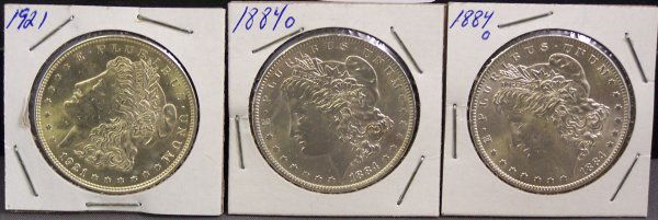 THREE SILVER MORGAN DOLLARS 1884,1884,1921