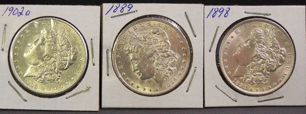 THREE SILVER MORGAN DOLLARS 1889, 1898, 1902