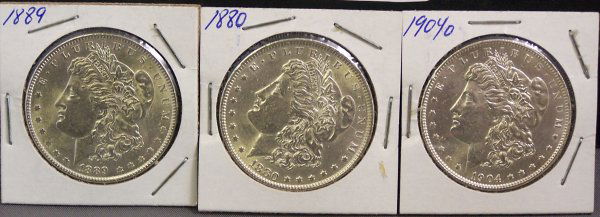 THREE SILVER MORGAN DOLLARS 1904, 1889, 1880