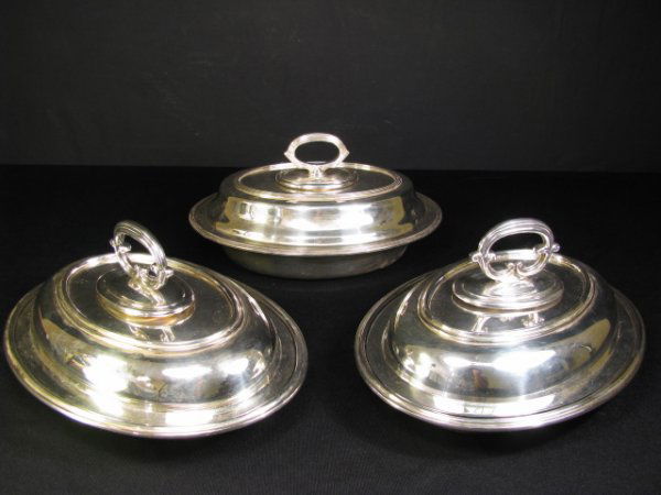 THREE SILVER PLATE OVAL COVERED SERVING BOWLS