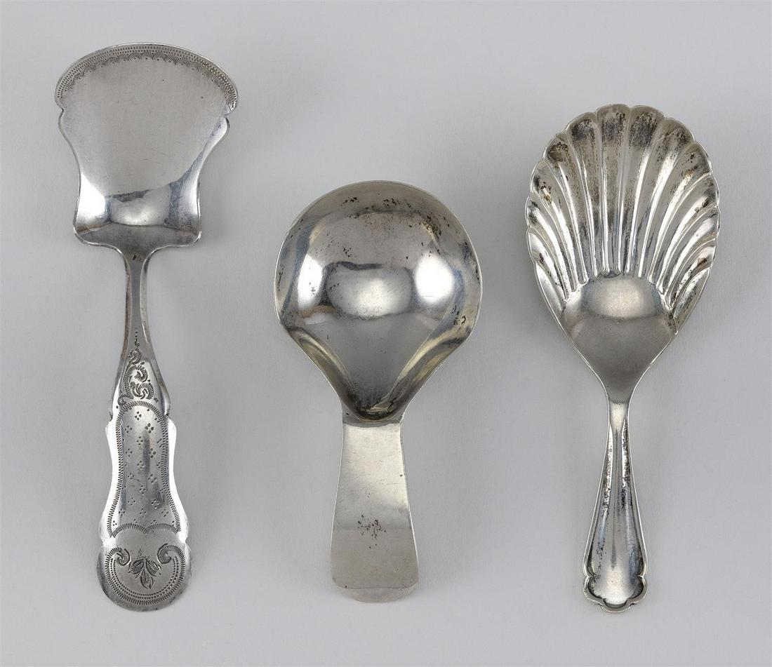 THREE SILVER TEA CADDY SPOONS Two English sterling