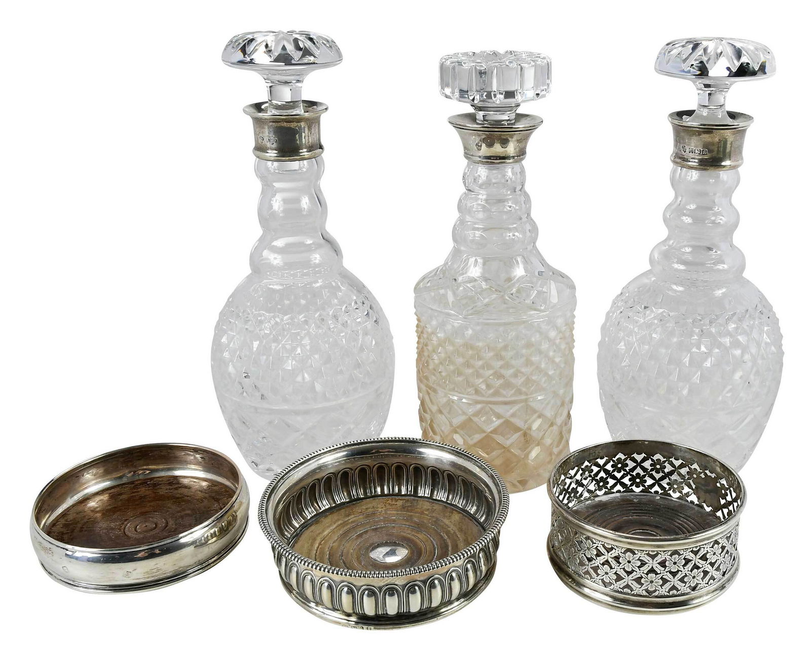 Three Silver Wine Coasters and Silver Mounted Decanters