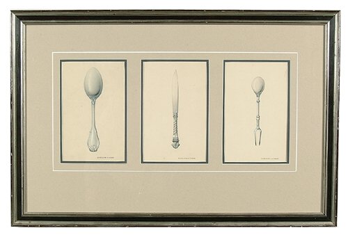 Three sketches for flatware, ink, pencil