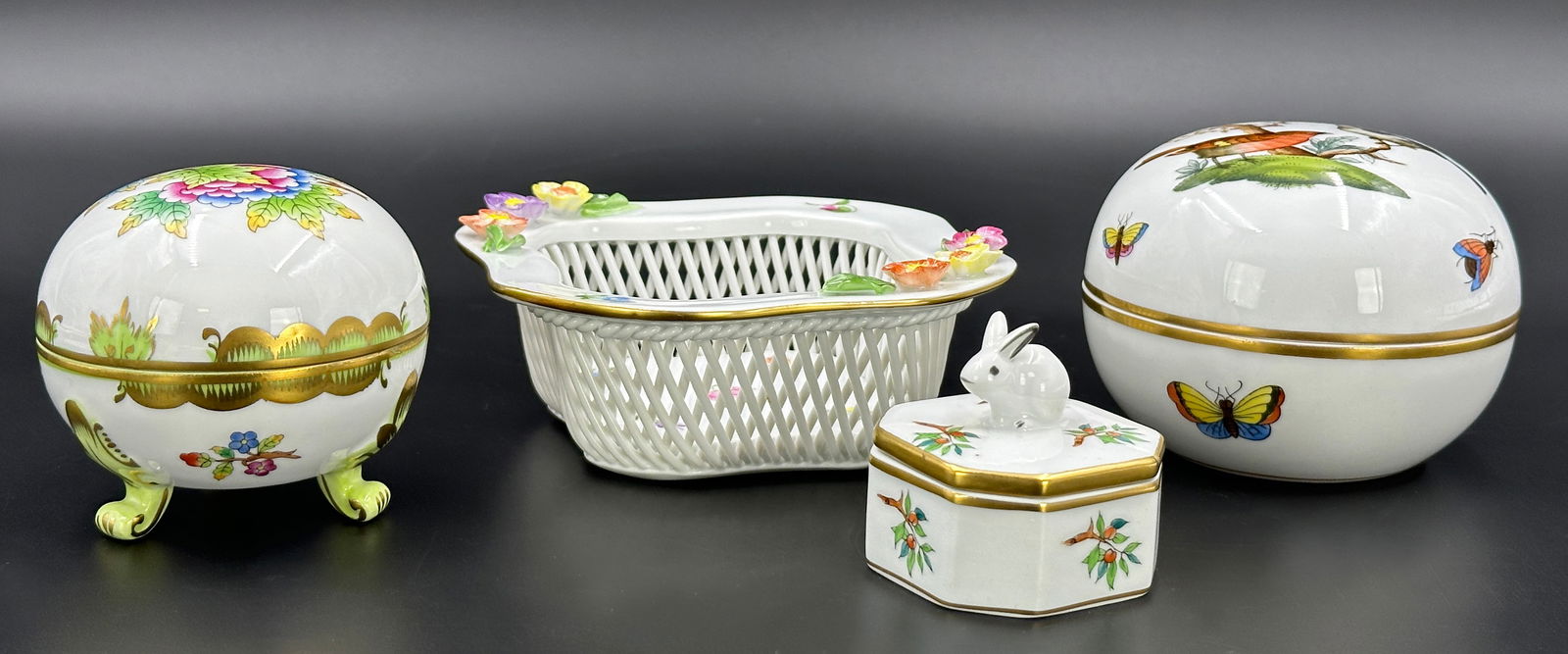Three small lidded jars and a small bowl. HEREND.
