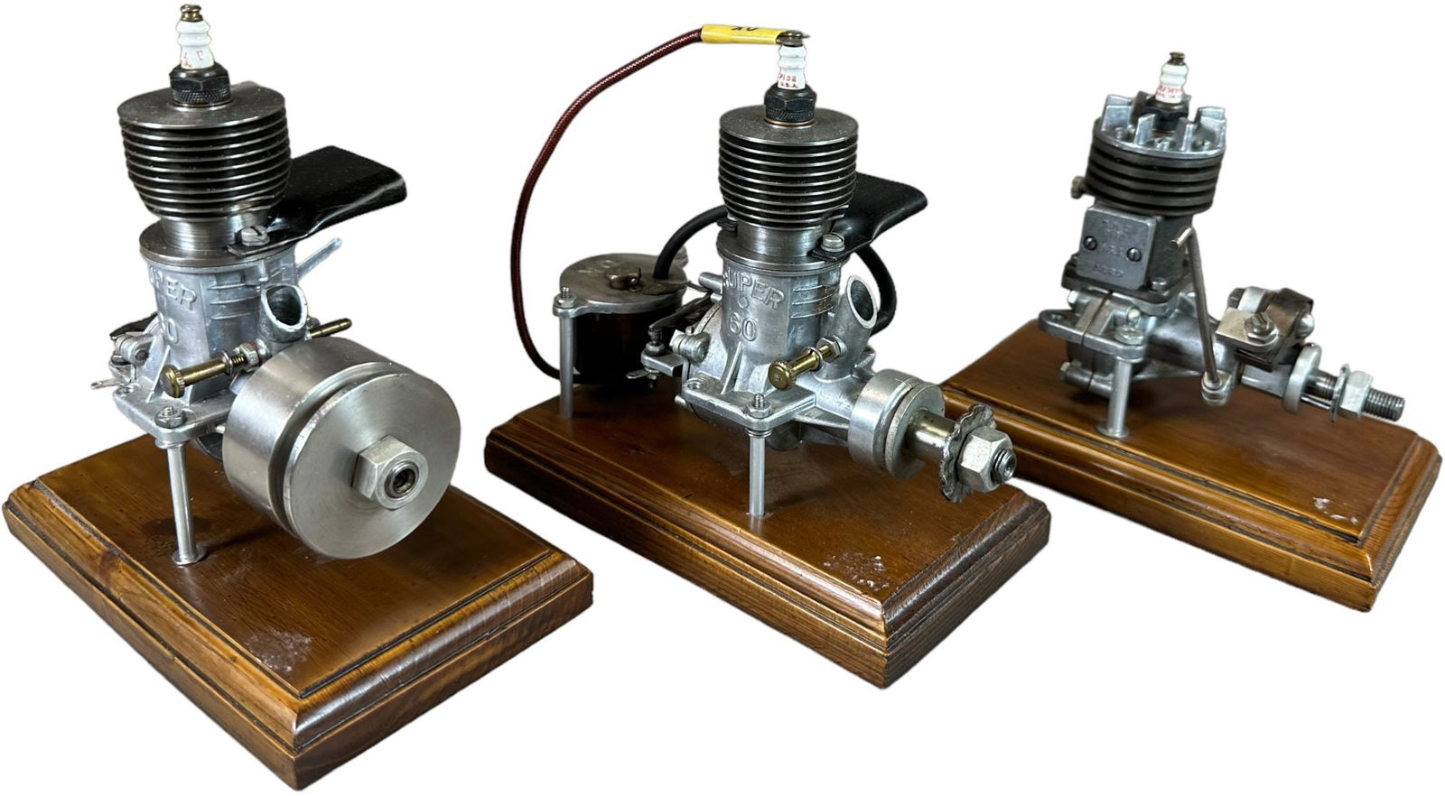 SoldSPARK IGNITION AIRPLANE ENGINES1498. SPARK IGNITION AIRPLANE ENGINES | Pacemaker .59 with magnesium case, O&R .60 custom with eagle, and a Madewell .49 with metal tank. | 6" l. base | (Excellent Condition) | $200 - $400See Sold Price