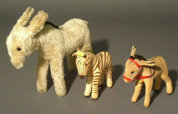 Three Steiff animals- donkey with no tag or button