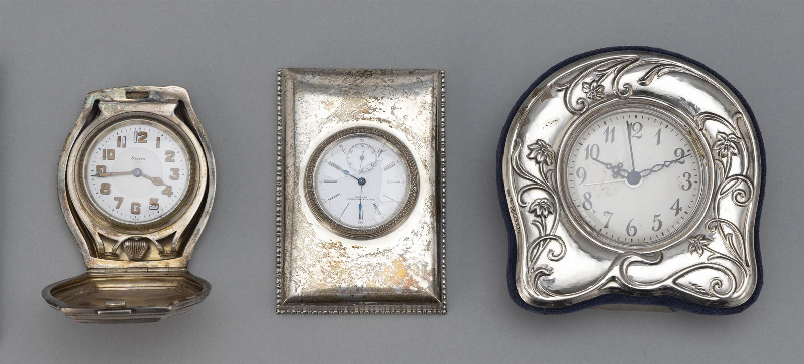 THREE STERLING SILVER-MOUNTED BOUDOIR CLOCKS A Black,