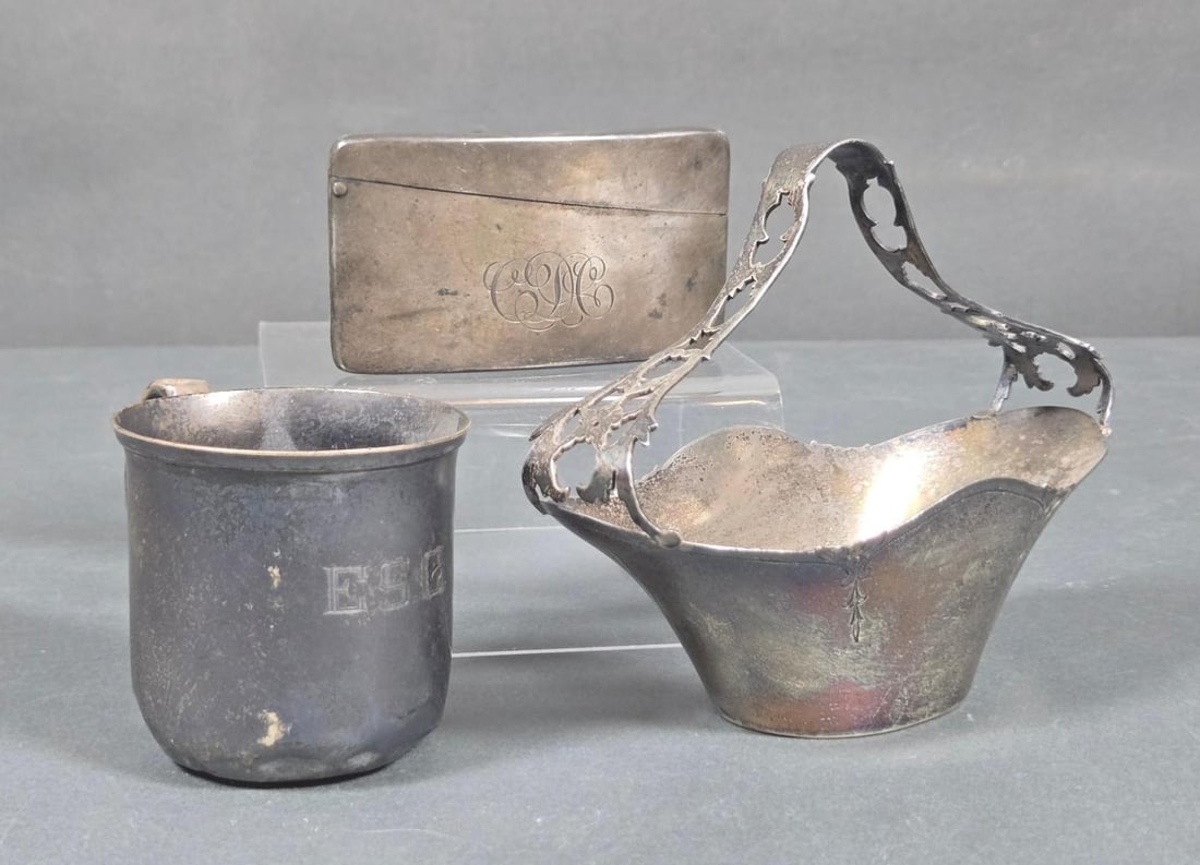 Three Sterling Silver Objects, comprising a Mug, Basket, and Hinged Case