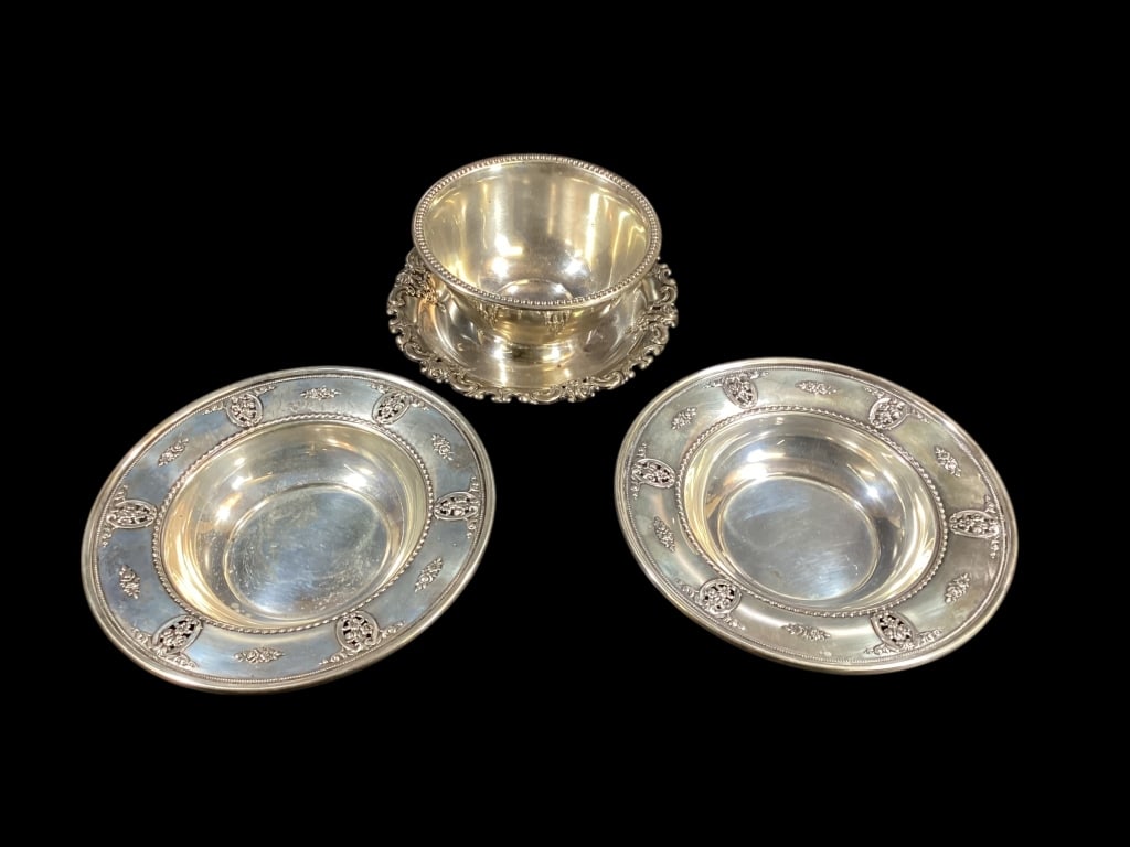 SoldThree Sterling Silver Table ArticlesGorham 6 inch diameter bowl, small foliate rim, 7 inch oval dish with poppy flowers, 6 inch dish with lily of valley flowers, monogrammedSee Sold Price