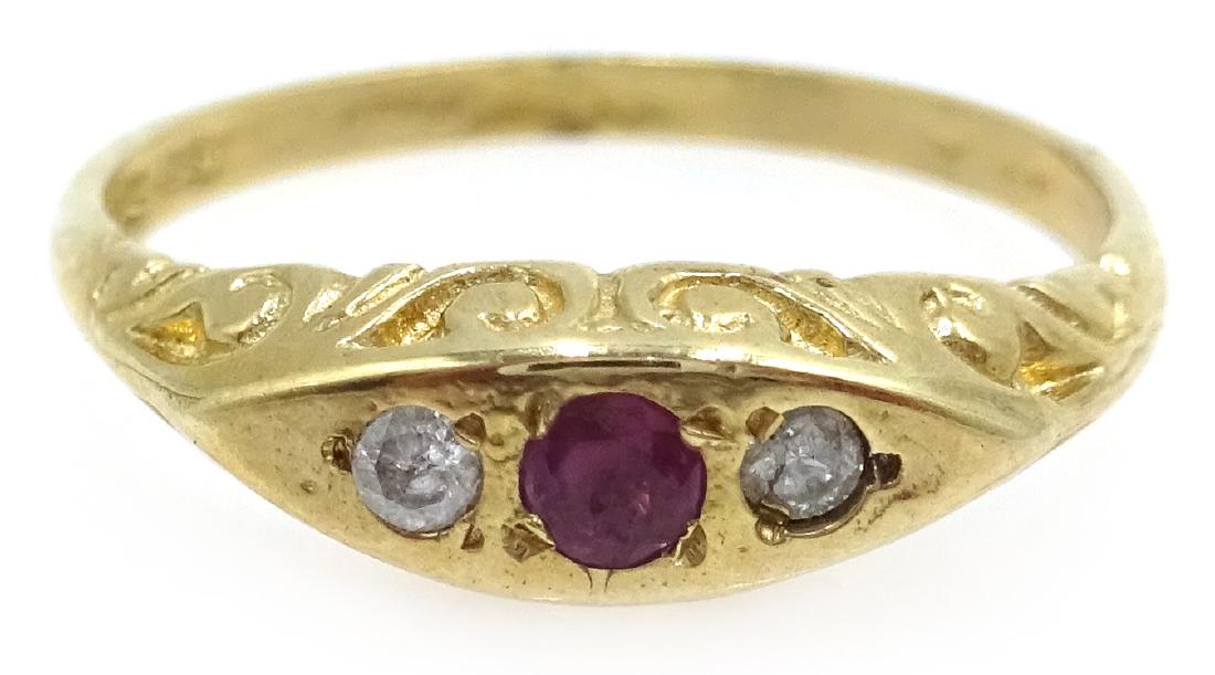 Three stone ruby and diamond gold ring, hallmarked 9ct