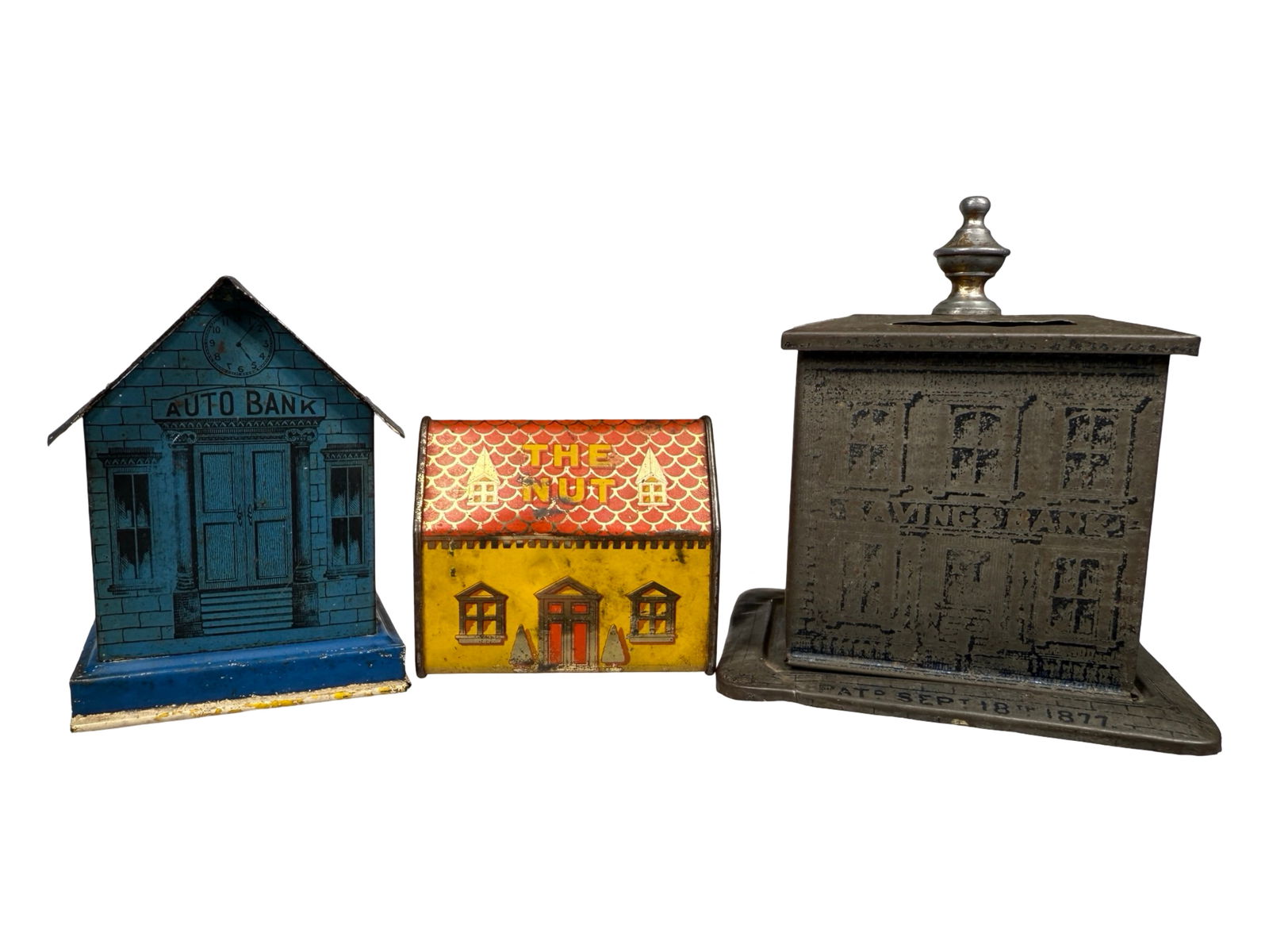 SoldThree Tin Building BanksThree Tin Building Banks, various manufacturers, circa 1920. They range from 2.5 to 3.25" tall. All are in very fine condition.See Sold Price