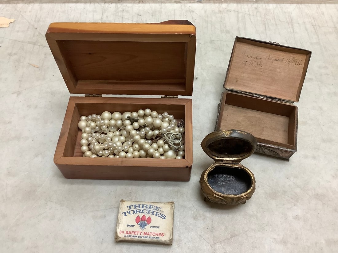 Lot of pearl jewelry, vintage Three Torches matches, and more