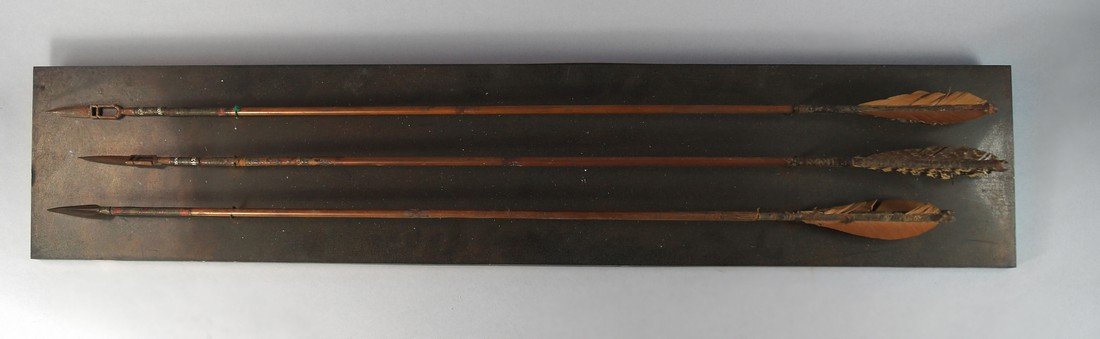 Three Turkish Ottoman arrows mounted on wall plaque,