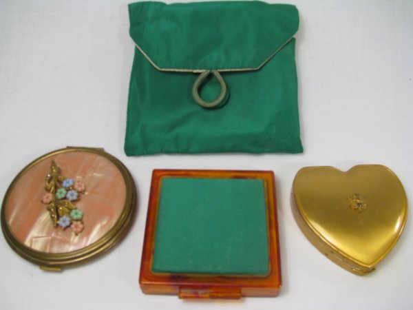 THREE VANITY COMPACTS HEART SHAPE, ROUND & SQUARE