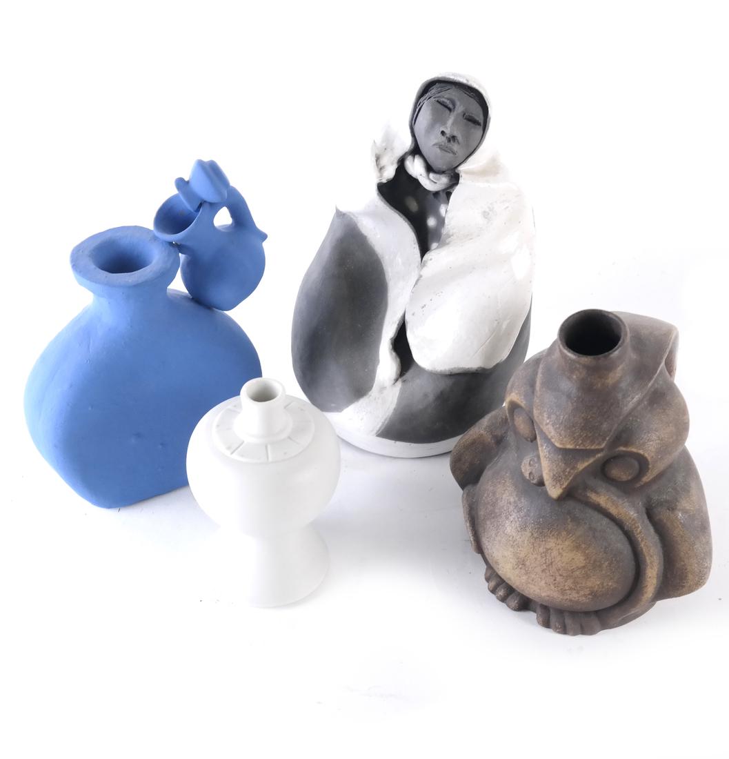 SoldA Group of Three Ceramic Vesselscomprising two figures, each with an opening to top of head, each inscribed "Recuerdo de Oaxaca" and signed illegibly by the artist (10 1/4 in. high and 9 1/4 in. high),; and a tripod pot, unmarked (8See Sold Price