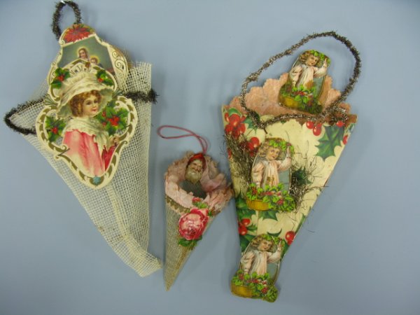 THREE VICTORIAN CHRISTMAS CONE CORNUCOPIA ORNAMENTS