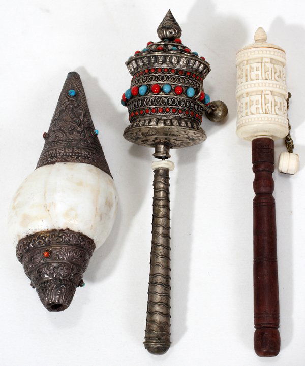 TIBETAN METAL & BONE PRAYER WHEELS & A SHELL,