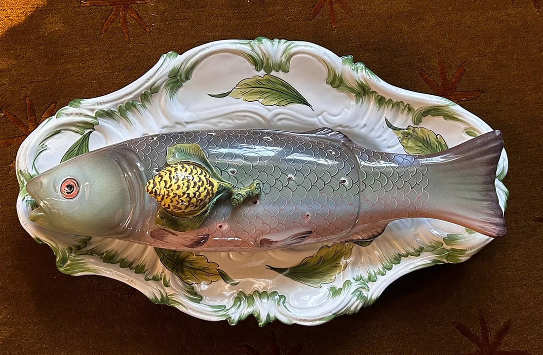 Sold13pc Royal Worcester for Tiffany & Co. Porcelain Fish Dinnerware SetPorcelain fish dinnerware set, comprising of one large oval serving platter and twelve matching 9-inch plates. Each piece features hand-painted aquatic scenes with various species of fish, detailed reSee Sold Price