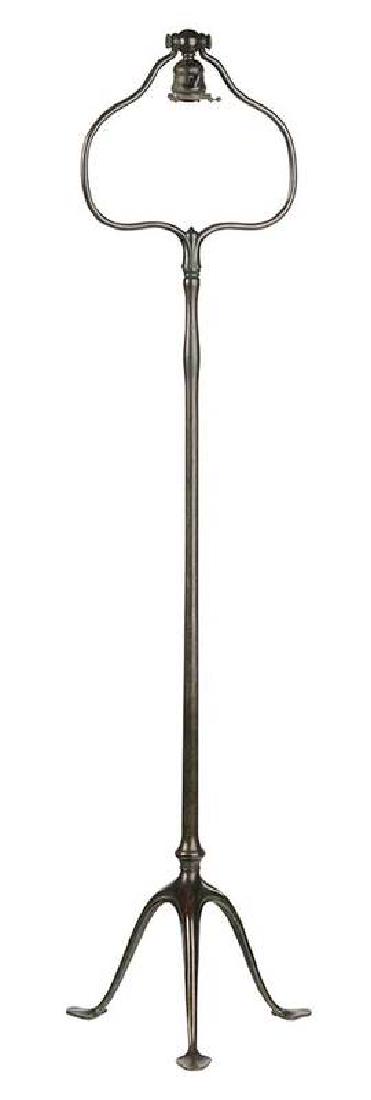 SoldTiffany Studios Harp Floor Lamp BaseA Tiffany Studios Bronze Floor Lamp Base. Slender standard raised on three legs ending in spade feet, having a light brown patina. No apparent markings. Circa 1910. Condition B; socket is likely a repSee Sold Price