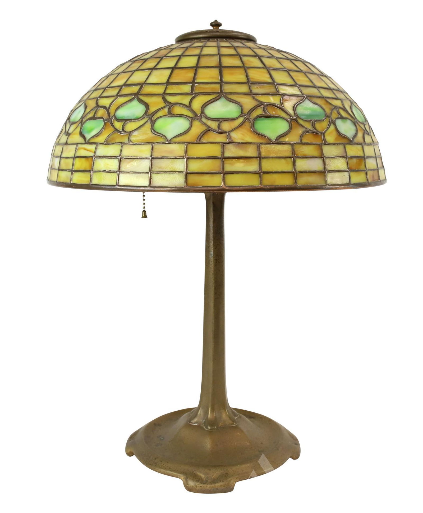 SoldTiffany Studios Acorn Table LampTiffany Studios Green Acorn Table Lamp. The graduated pale green mottled trapezoidal tile shade with a green and amber mottled band of tiles on a bronze cylindrical standard on a spreading petal formSee Sold Price