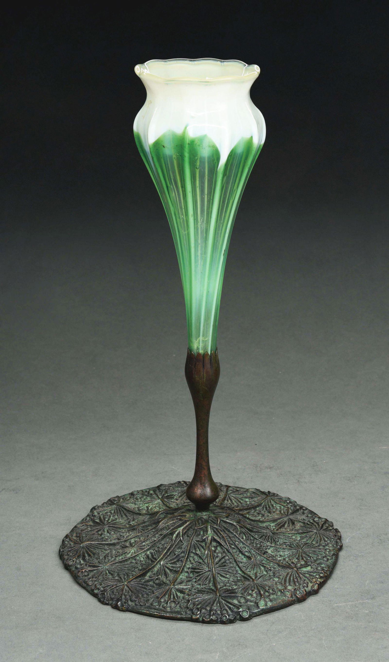 SoldTIFFANY STUDIOS Floriform vase with bronze baseTIFFANY STUDIOS Floriform vase, New York, 1900s Favrile glass, patinated bronze Base stamped TGDCO. TIFFANY STUDIOS NEW YORK 1743 13" x 5 1/2"See Sold Price