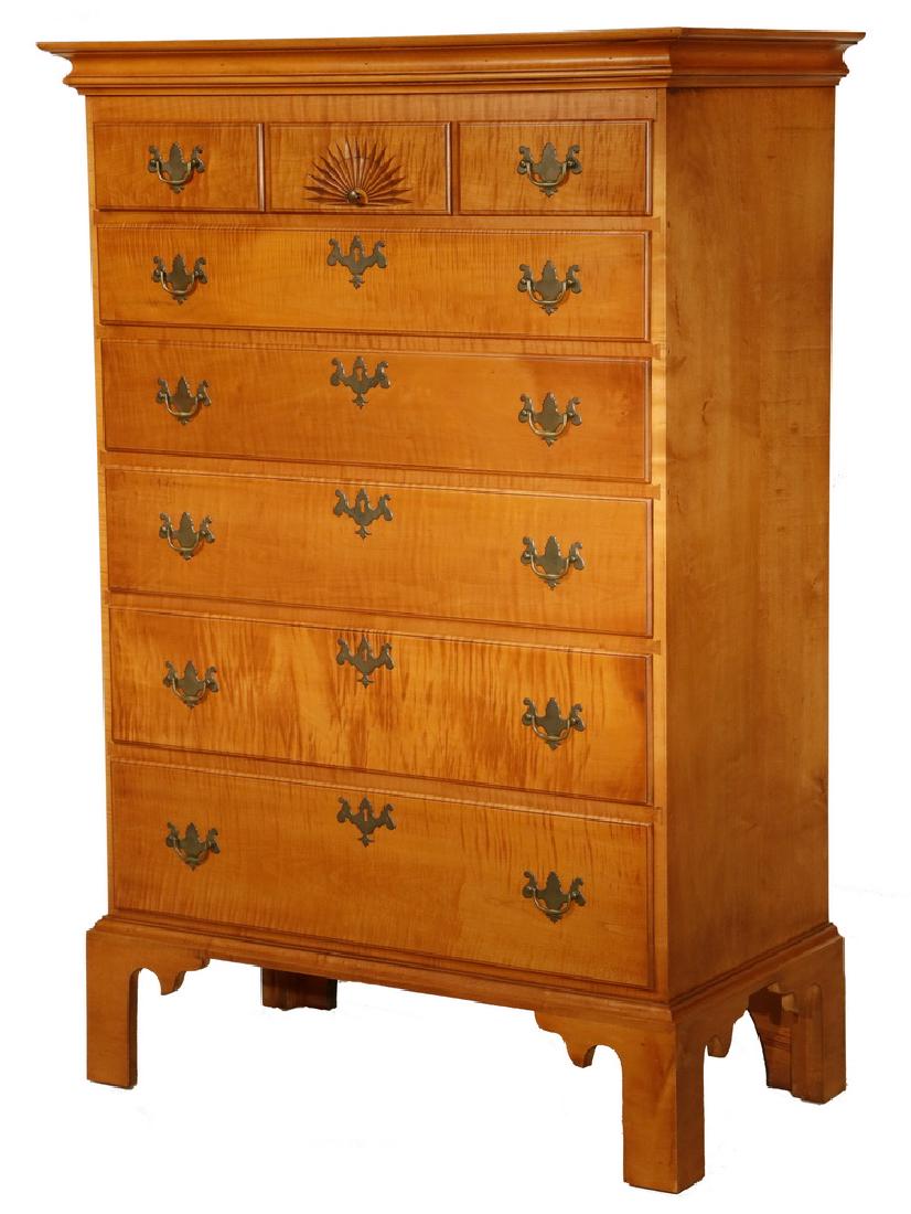 TIGER MAPLE HEPPLEWHITE TALL CHEST BY ELDRED WHEELER
