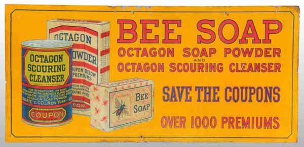 SoldOctagon Soap Tin Sign19.75" x 13.5" Embossed sign with scuffs, scratches, stains, bends, holes, flakes, and rust. PLEASE NOTE, THERE IS ONLY ONE WAY TO PAY FOR ONLINE ITEMS IN THIS AUCTION WHICH IS THROUGH LIVE AUCTIONEERSee Sold Price