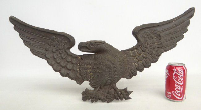SoldTin EagleTin painted eagle plaque. American. 19th century. H 11-1/2" W 25-1/4". Condition: Some dents.See Sold Price