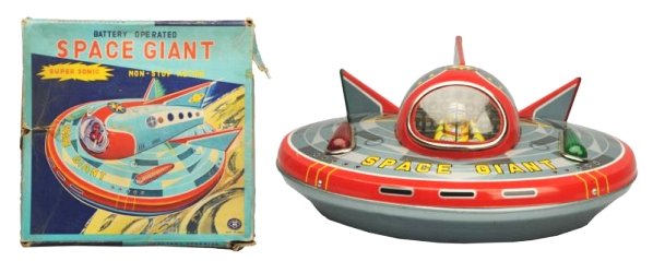 SoldJapanese Tin Litho Battery Operated Space Giant.One of the largest saucer toys made. Made by Masudaya. Lithographed version. When in operation, battery operated flying saucer moves with mystery action, lights blink on and off. Box with inserts hasSee Sold Price