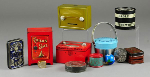 Lot - 2 Mahogany Jewelry Boxes, Poker Chips, Etc.3 days LeftVintage Calendar and Coin Bank Advertising Lot Inc. Colliers, First Savings, First Nat., North Akron6 days LeftLot 5 Antique Gun Powder Advertising Tins EtcMar 07, 2026ASSORTED ANTIQUE AND COLLECTIBLE ARTICLES, LOT OF TENMar 04, 2026Lot of Art Deco Items - Frankart, Will George, Etc3 days LeftLOT OF TALC / INCENSE TINS2 days LeftLOT OF VINTAGE MAKE-UP TINS2 days LeftCast Iron Safe Deposit Banks and State Safe Still Bank4 days Left(6) Tin & Pressed Steel Safe Banks4 days LeftVARIETY OF VINTAGE BANKSMar 15, 2026(3) Thrift Dial Safe Banks4 days LeftGroup of Vintage Coin BanksMar 07, 2026(9) Cast Iron State Safe Banks4 days Left(3) Early Cast Iron Safe Still Banks4 days Left(9) Modern Miniature Safe Banks4 days LeftCOLLECTION OF POWDER TINS, KEGS AND FLASK 19th Century Lengths from 4" to 8.5".Mar 05, 2026