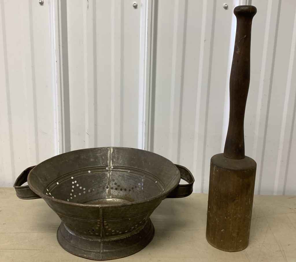 tin strainer and wood masher