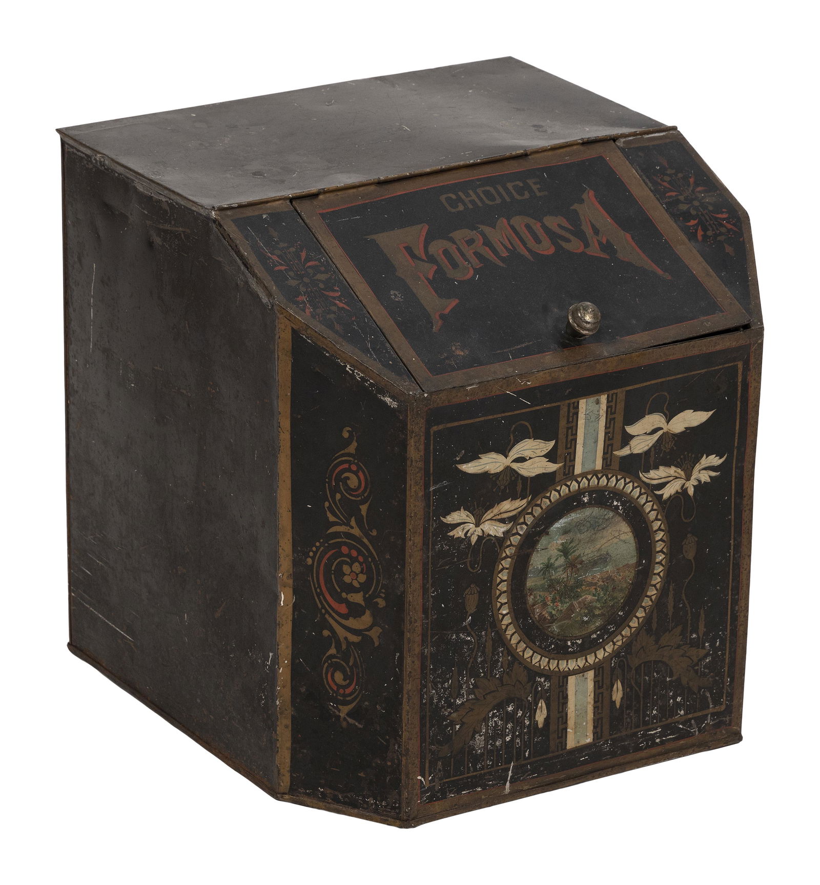 TIN TOLEWARE TEA BIN 19th Century Height 17”. Width 16”. Depth 16”.
