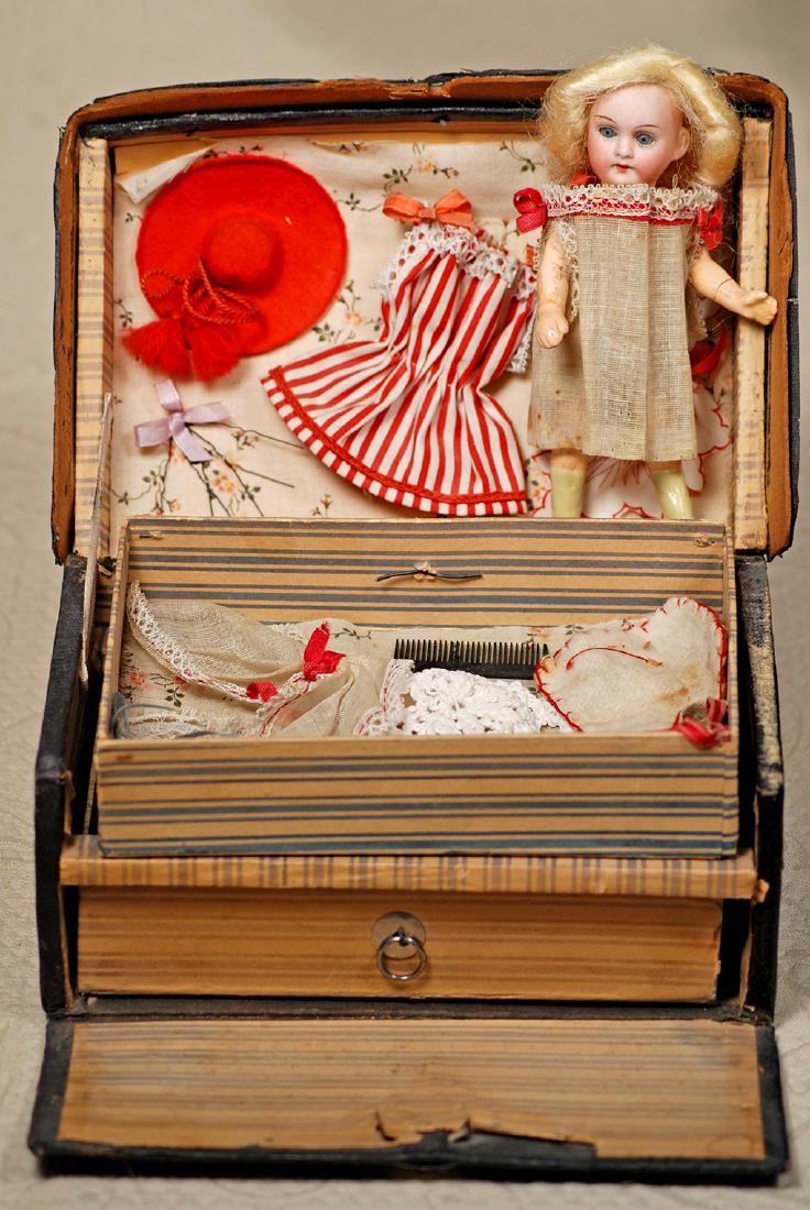 TINY GERMAN BISQUE DOLL IN PRESENTATION CASE. 5".