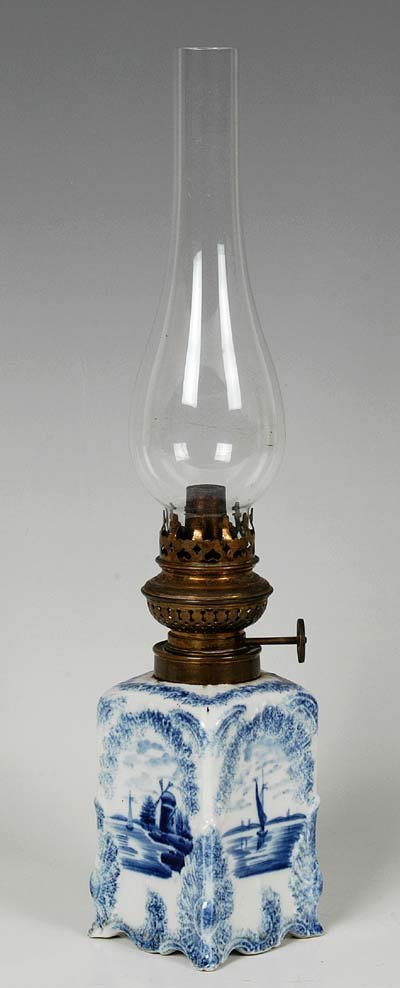 Tischpetroliumlampe, hellblau bemalter reliefiert