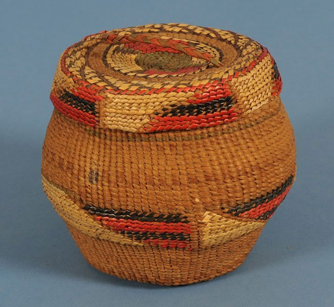Tlingit Lidded Spruce Root Polychrome Basket 3 1/2"