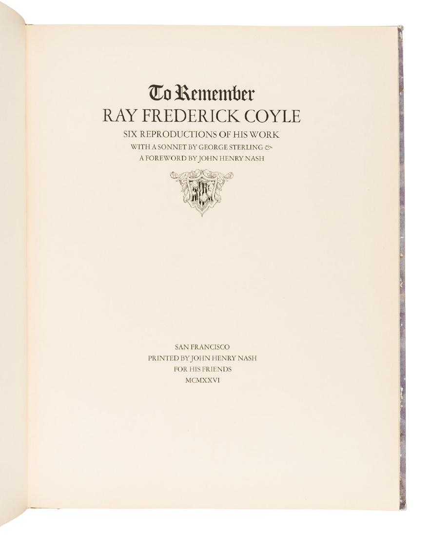 Sold[DOHENY, Estelle (1875-1958), her copy]. [NASH, John Henry ...[DOHENY, Estelle (1875-1958), her copy]. [NASH, John Henry (1871-1947), printer and publisher]. To Remember Ray Frederick Coyle. Six Reproductions of His Work with a Sonnet by George Sterling & a ForeSee Sold Price
