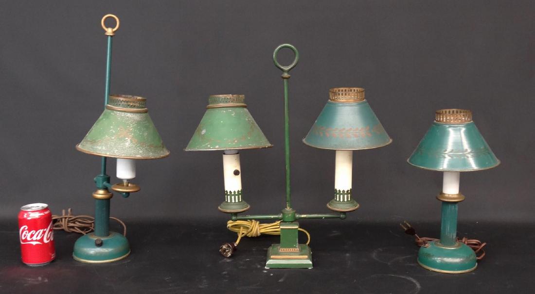 SoldTwo Vintage French Diminutive Tole Lampsearly 20th century, including a Louis XV style double arm gilt brass lamp with oval painted metal shade; and a Neoclassical style two light lamp with adjustable metal shade raised on paw feet. TallerSee Sold Price