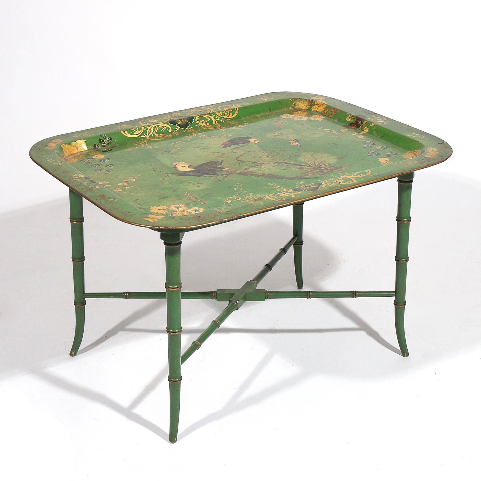 SoldRegency Style Faux Bamboo Painted Tole Tray TableRegency Style Faux Bamboo Painted Tole Tray Table. Regency style painted tole tray inset in a black lacquered faux bamboo stand. The tole tray had gold leaf hand painted leaves and vines. Legs are conSee Sold Price