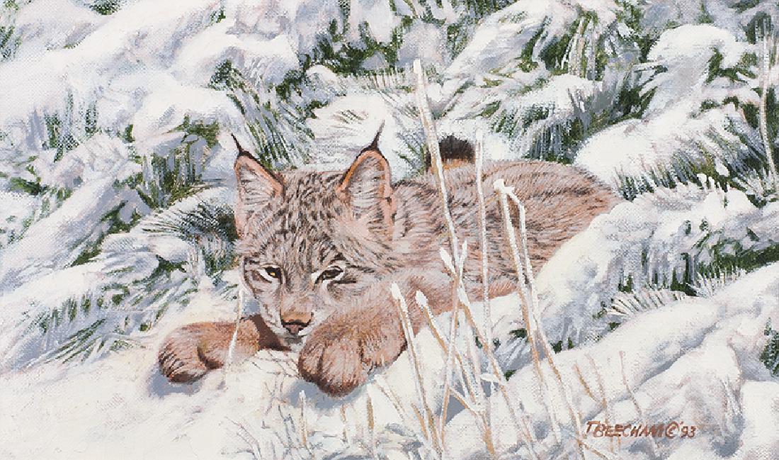 SoldTom Beecham Signed Original Oil PaintingOriginal oil painting on canvas that depicts a small herd of deer running through the snow. The artwork is signed in the center-left area of the painting by the artist, Tom Beecham. The frame measuresSee Sold Price