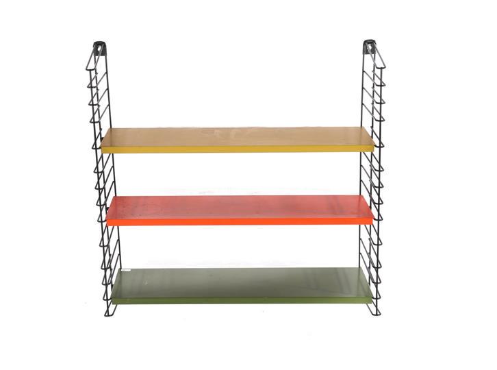 SoldAdriaan DekkerAdriaan Dekker (1923-1982)Polychrome metal wall rack with blackened holders 66 cm high, and 3 shelves 65x19 cm, design Adriaan Dekker for Tomado, the Netherlands, 1950sSee Sold Price