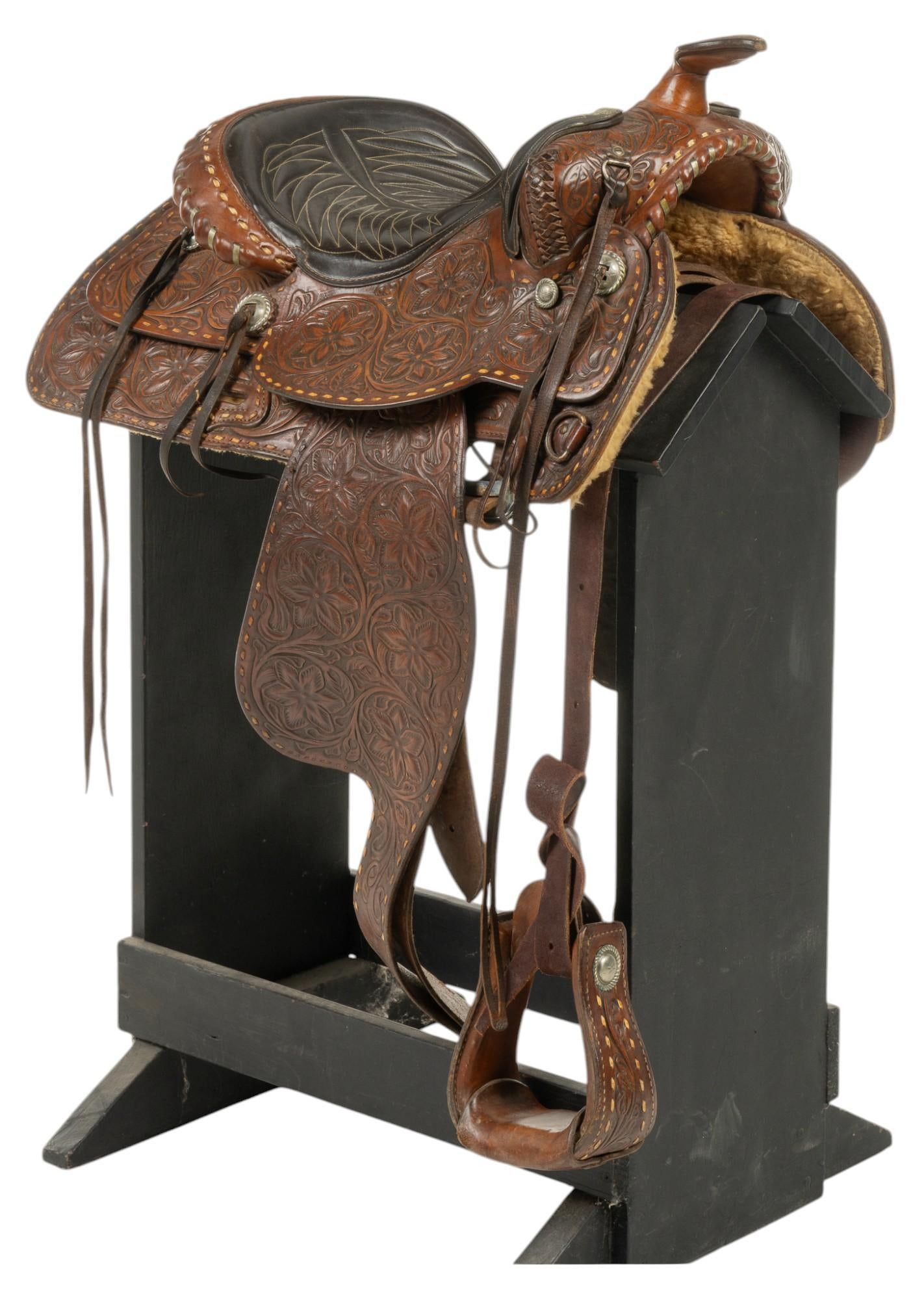 SoldVintage Leather Horse SaddleVintage horse saddle, featuring tooled leather throughout, rope cinch, stand not included height 39 in. x width 26 in. x depth 24 in. Provenance: Property from the collection of a San Antonio, TexasSee Sold Price