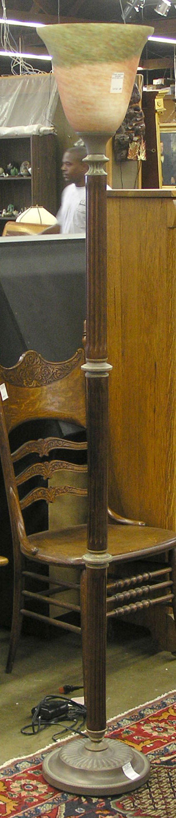 SoldPr Art Deco Metal Glass Torchiere Shade Floor LamPr Art Deco Metal Glass Torchiere Shade Floor Lamps. Frosted Amber glass shade-- Dimensions: H: 66 inches: W: 12 inches: D: 12 inches ---See Sold Price