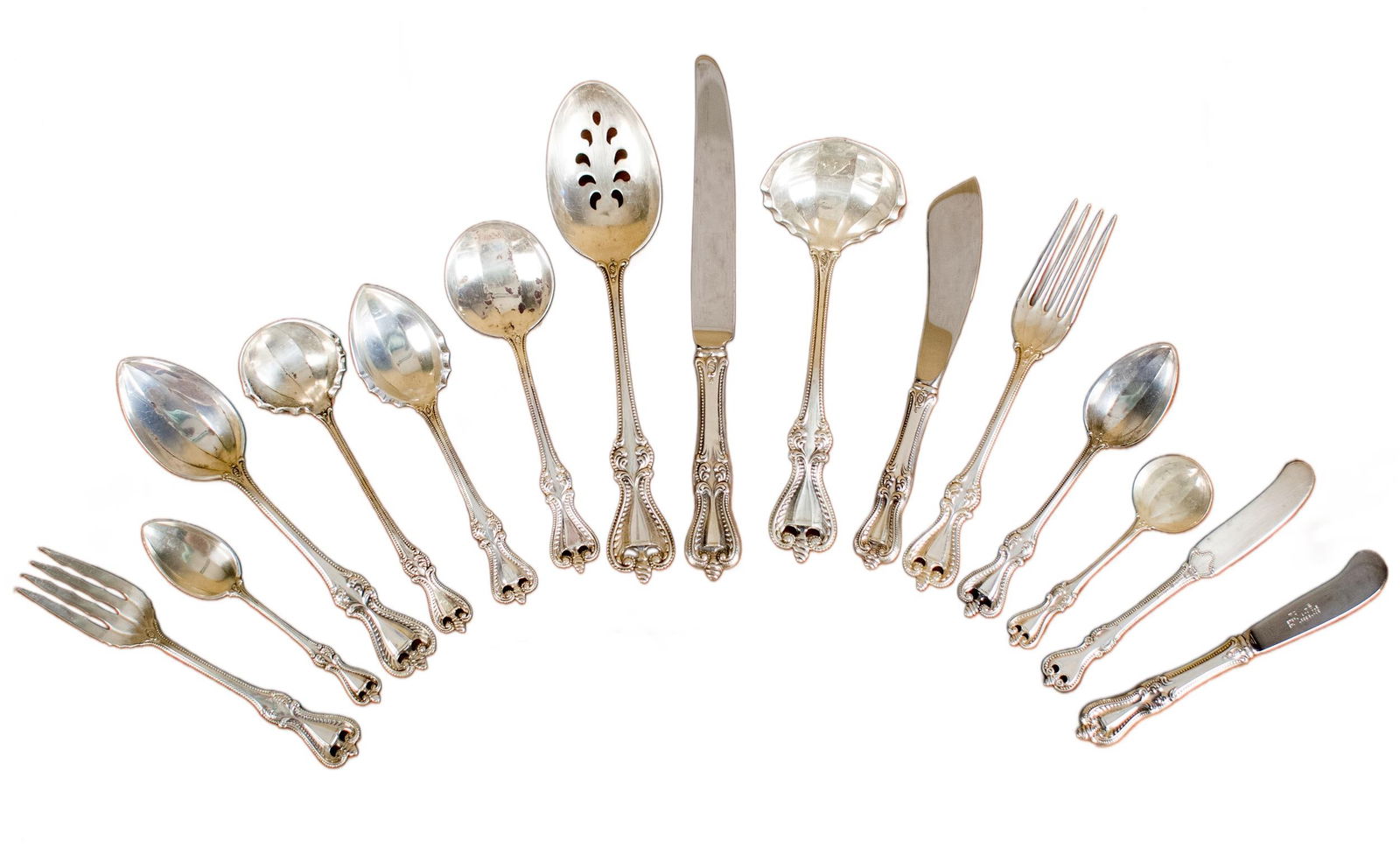 9PC LOT OF STERLING SILVER, 22 T.O.W.Mar 07, 2026Large lot of sterling silver and silver handled utensils. To include: Durgin serving fork and spoonMar 01, 2026Lot of sterling silver spoon sets. To include: 1) Towle set of 12 teaspoons. 6.2 ozt. 2) Durgin setMar 01, 2026TOWLE EL GRANDEE STERLING FLATWARE SET.Feb 25, 2026GROUP OF VARIOUS-PATTERNED SILVER FLATWARE, 2682gFeb 25, 2026INTERNATIONAL STERLING FLATWARE SET, BRIDAL VEIL.Feb 25, 2026S. Kirk & Son Repousse pattern sterling silver 13pc. flatware and serving pieces, 14.630ozt. 75 days LeftGORHAM STERLING FLATWARE SET.Feb 25, 2026A Collection of Sterling flatware including S Kirk in Various Rose Patterns4 days Left128 Piece Towle Sterling "Candlelight" Flatware Set5 days Left57 Misc. Pieces of Sterling Silver FlatwareFeb 26, 202682 Piece Gorham Sterling "Covington" Flatware Set5 days LeftS Kirk & Son Sterling "Old Maryland-Engraved"Feb 26, 2026Watson Co. "Juliana" sterling flatware service.Feb 24, 2026A Lunt sterling silver Eloquence flatware service, mid 20th centuryFeb 25, 2026Stieff Sterling "Rose" Flatware ServiceFeb 26, 2026