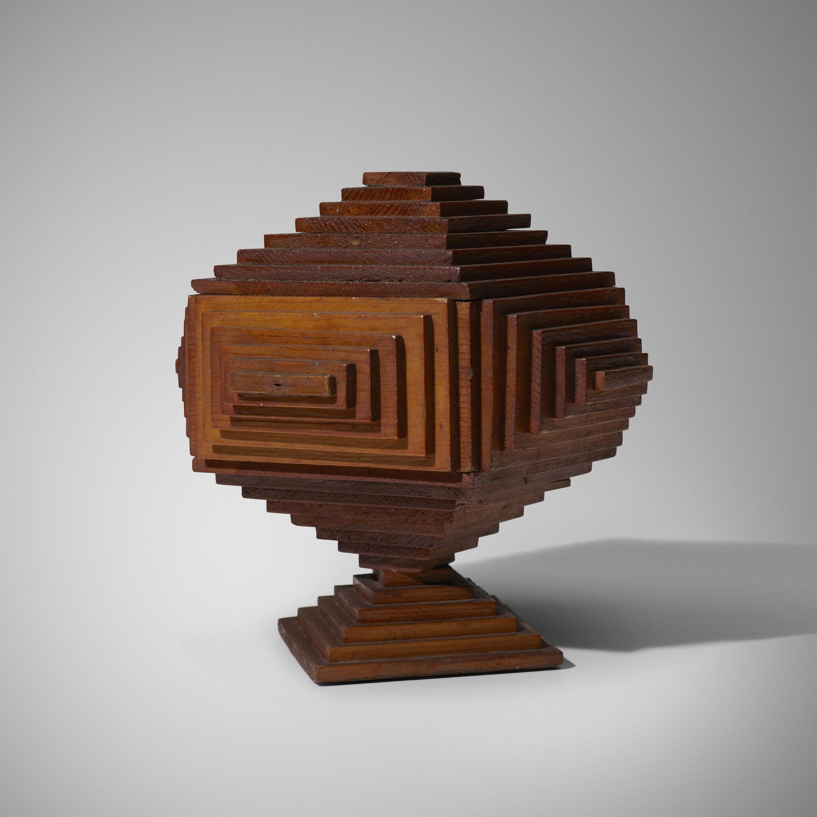 SoldSculptural Tramp Art Pedestal Box with Finial, c 1890Item: Sculptural Tramp Art Pedestal Box with Finial Size: 13.5 inches high x 9 inches wide x 9 inches deep Date: 1890s - 1900 8 sided deeply layered tramp art pedestal box with an acorn finial. Lift-tSee Sold Price
